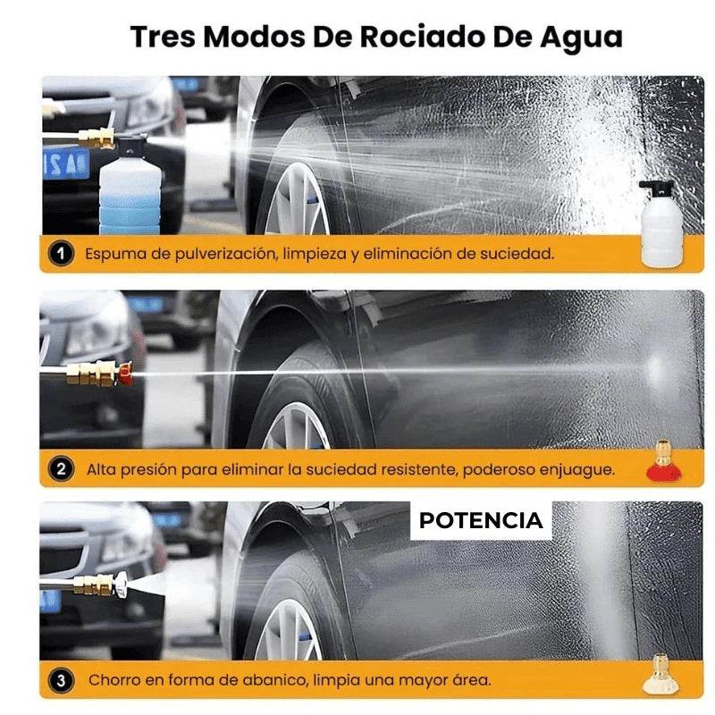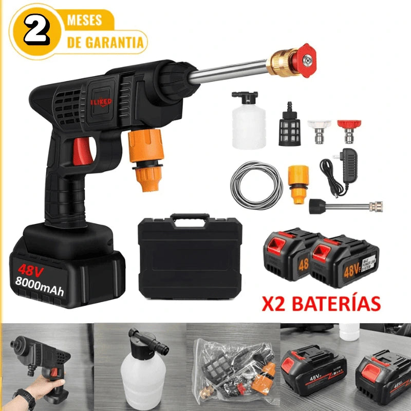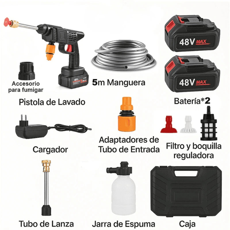 La hidrolavadora portátil PowerWash 48V te ofrece presión de agua profesional, espuma densa y limpieza en segundos. Ideal para autos, motos, patios, paredes, vidrios o jardinería.